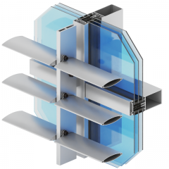 homlokzati rendszer, alumínium árnyékoló rendszer homlokzatokon, oszlop-bordás függönyfalon való használatra, szabályozva a fény beáramlását a belső térbe, biztosítva az épület nagyobb energiahatékonyságát