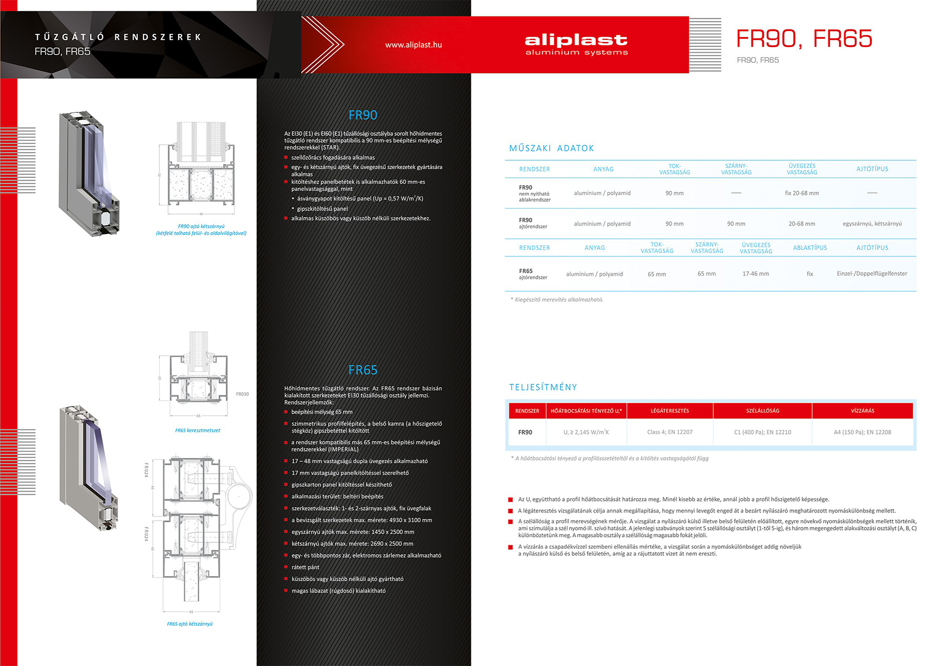 rendszer jellemzői:- alkalmazás: beltéri és homlokzati beépítés - beépítési mélység 90 mm - szimmetrikus profilszerkezet, gipszbetétekkel kitöltött központi kamra EI30-hoz (a hőszigetelő betétek között), EI60-hoz minden kamra gipsszel töltve - a rendszer kompatibilis a 90 mm-es beépítési mélységű rendszerekkel (STAR) - kétkamrás üvegezési lehetőség (üvegezés: 20 mm-től 69 mm-ig) - panelkitöltés lehetősége (60 mm vastag panel): ásványgyapot töltetű panelek (Up=0,57 W/m2K), gipsz kitöltésű panelek - szerkezetek: egy- és kétszárnyú ajtók, fix üvegezés - tűzálló és füstgátló szerkezetek készítésének lehetősége - menekülési útvonalon használható ajtószerkezetek készítésének lehetősége - a vizsgált szerkezet maximális méretei: 6000 x 3000 mm (fix fal, egy üvegtábla) - egyszárnyú ajtók maximális méretei: 1650 x 2870 mm - kétszárnyú ajtók maximális méretei: 3170 x 2870 mm - egy- vagy többpontos zárak, elektromos zárcsapdák, pánikszerelvények - rátett pántok, hengerpántok, INOX pántok - küszöbös és küszöb nélküli megoldások lehetségesek - rúgdosó (magas lábazat) - szellőzőrács használatának lehetősége