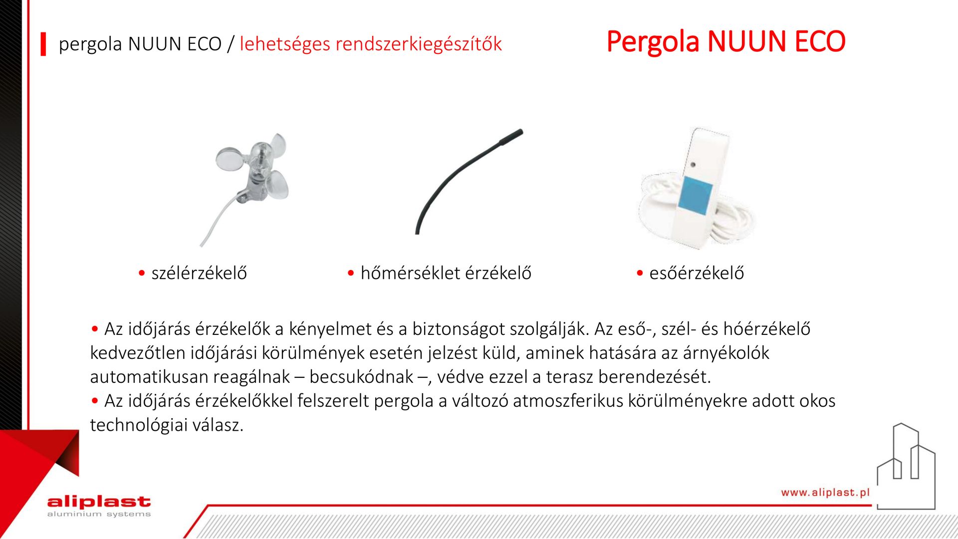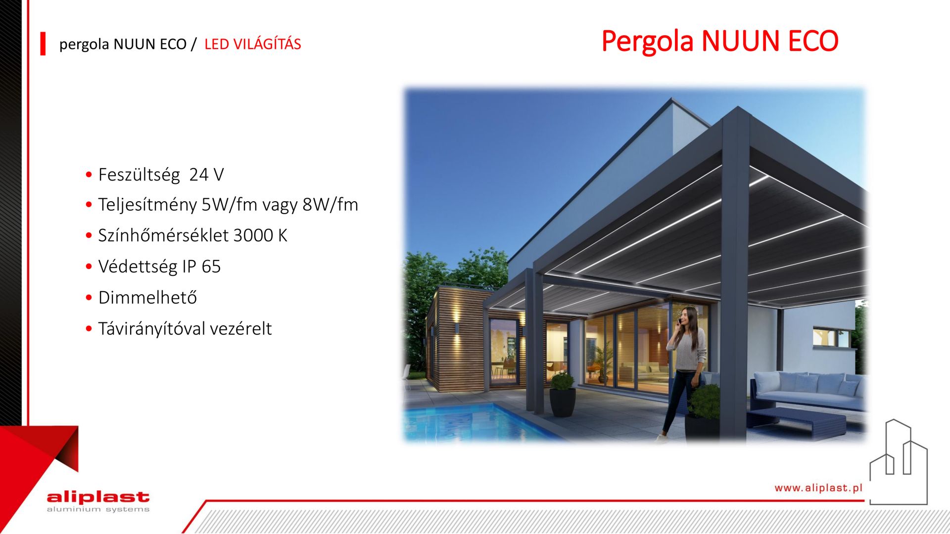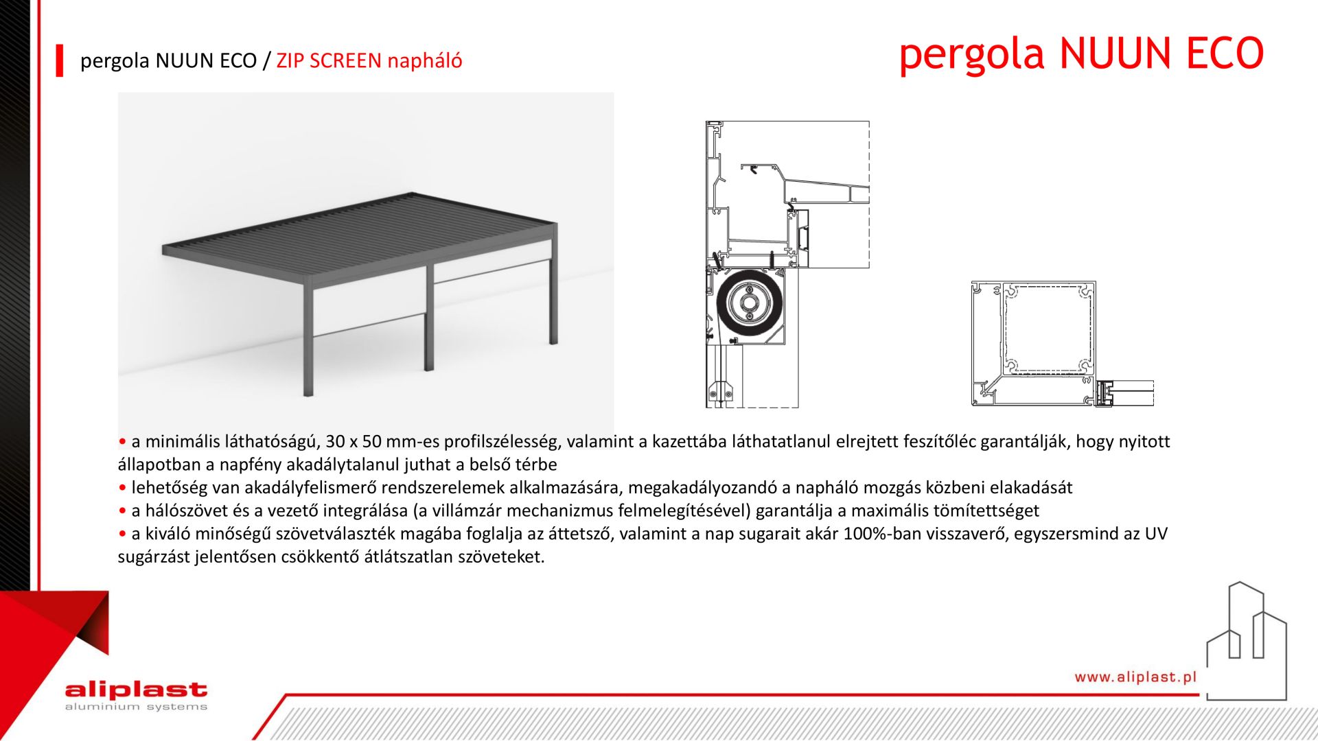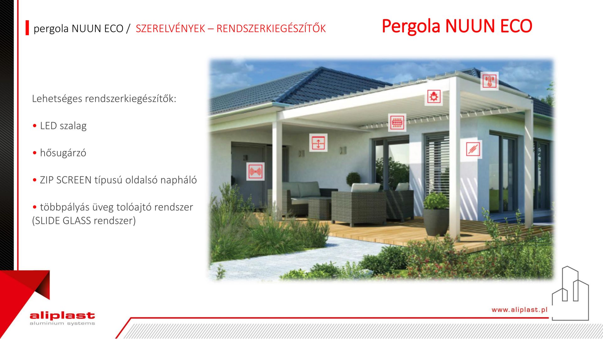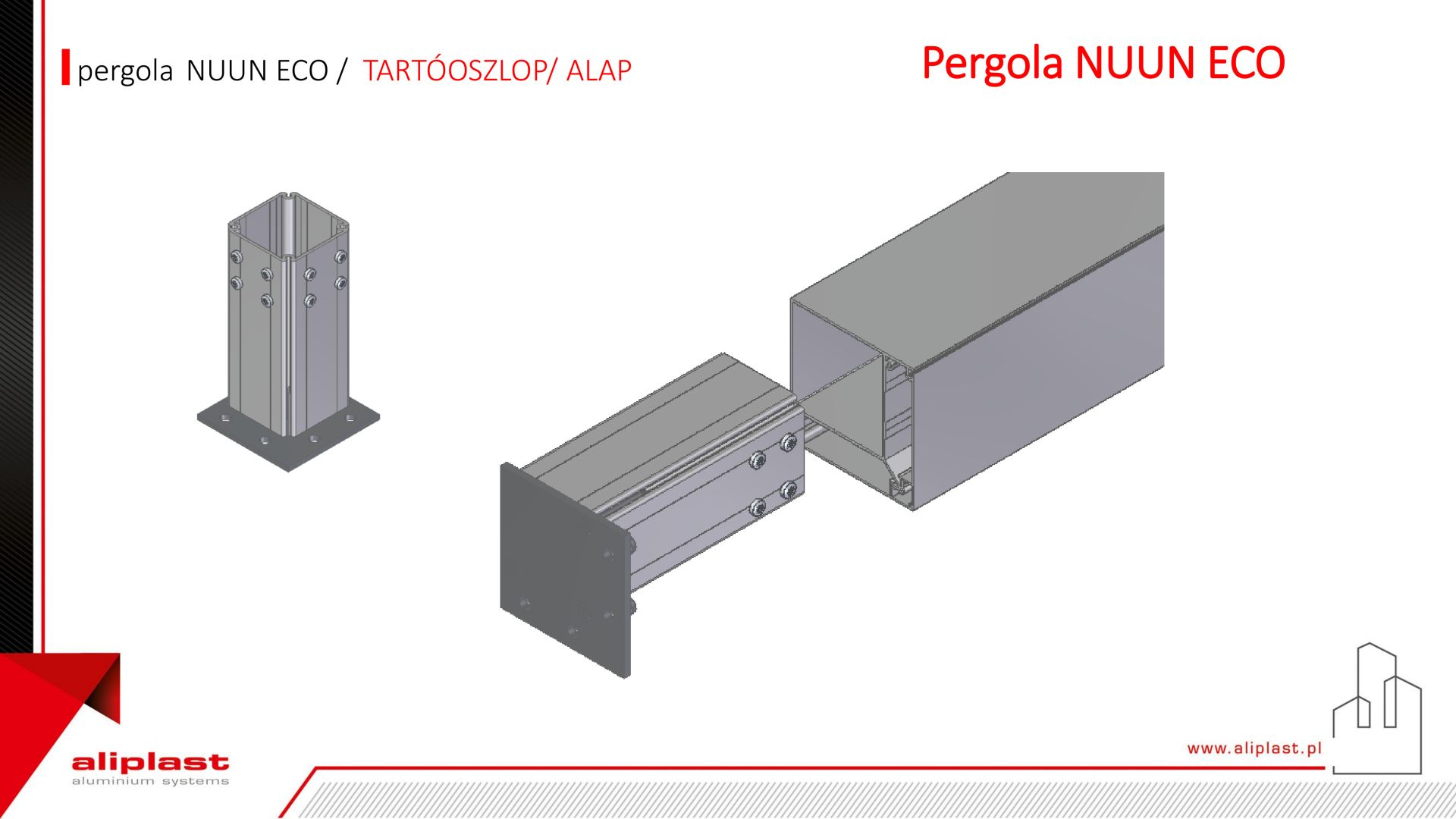 a NUUN ECO pergola zárt teteje szorosan a keretre fekszik, így a lamellák és a szerkezetváz tömítéseinek köszönhetően szigetelt tetőt alkot integrált vízelvezető rendszer az oszlopban további elemek beépítése és a rendszer bővítése: