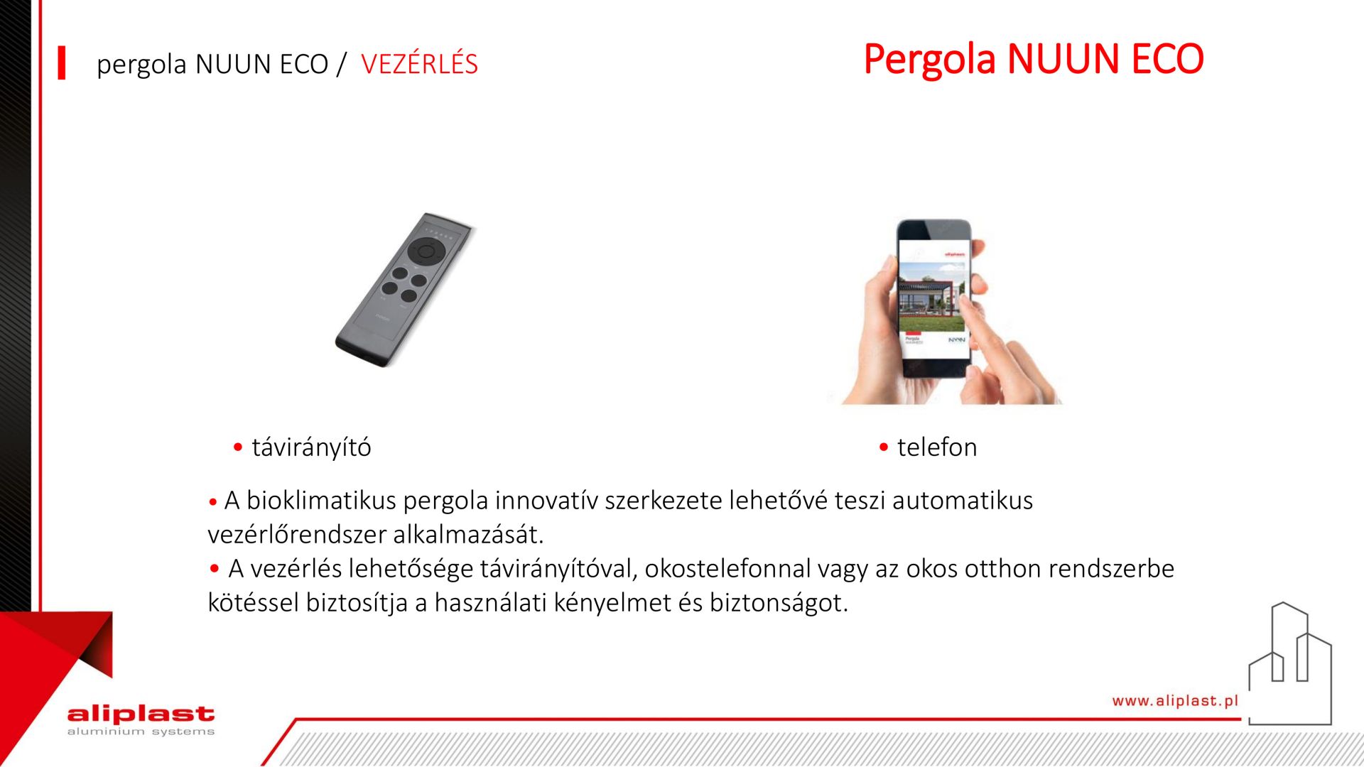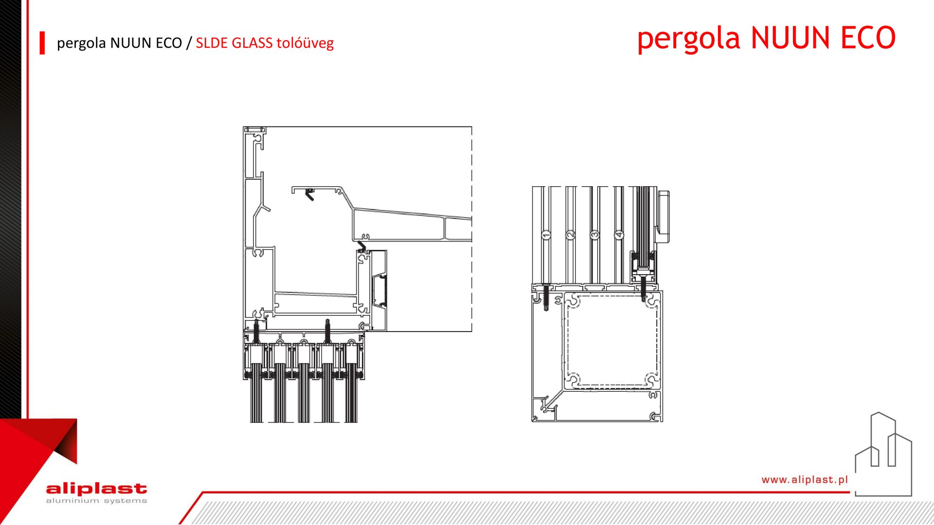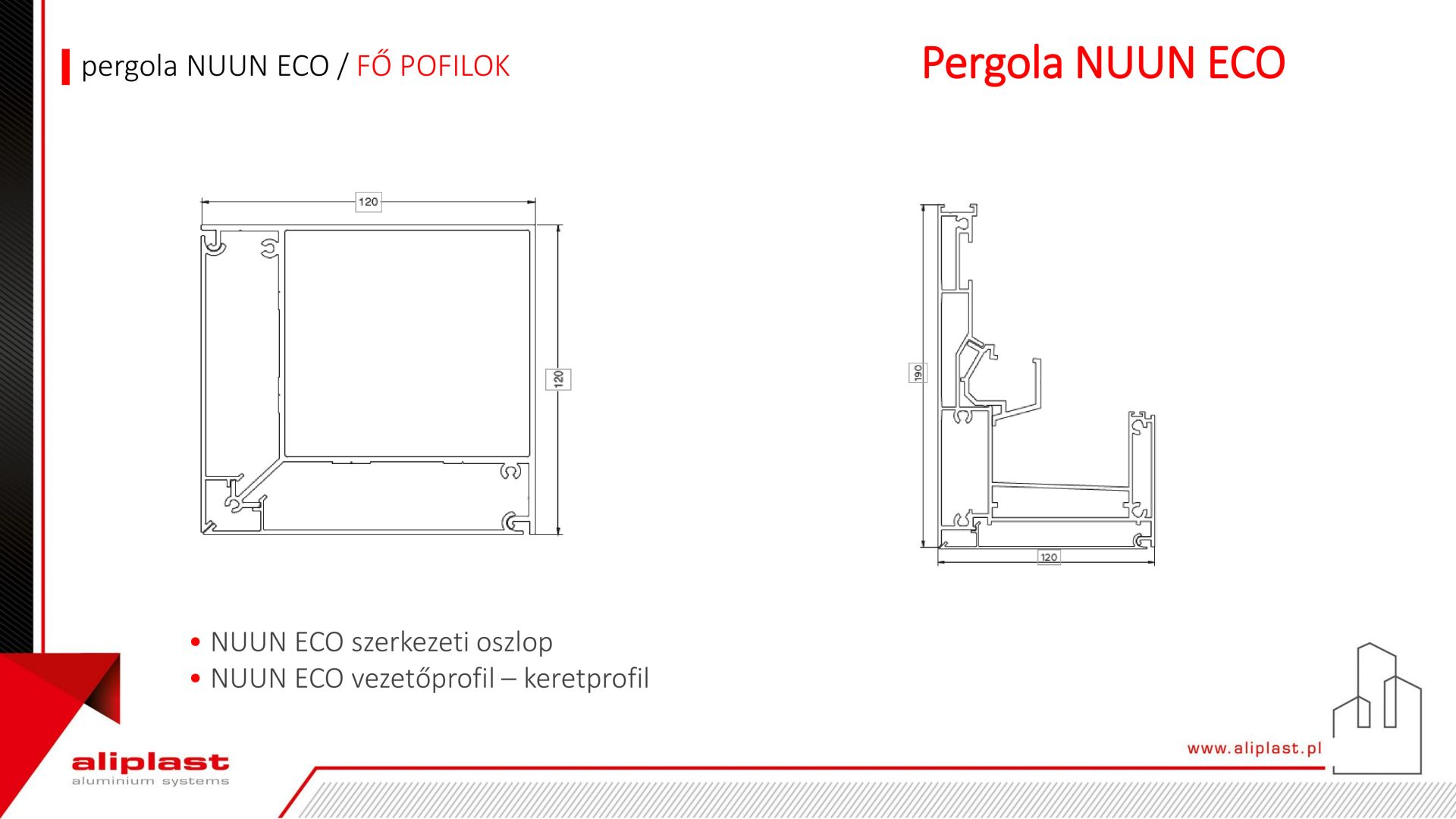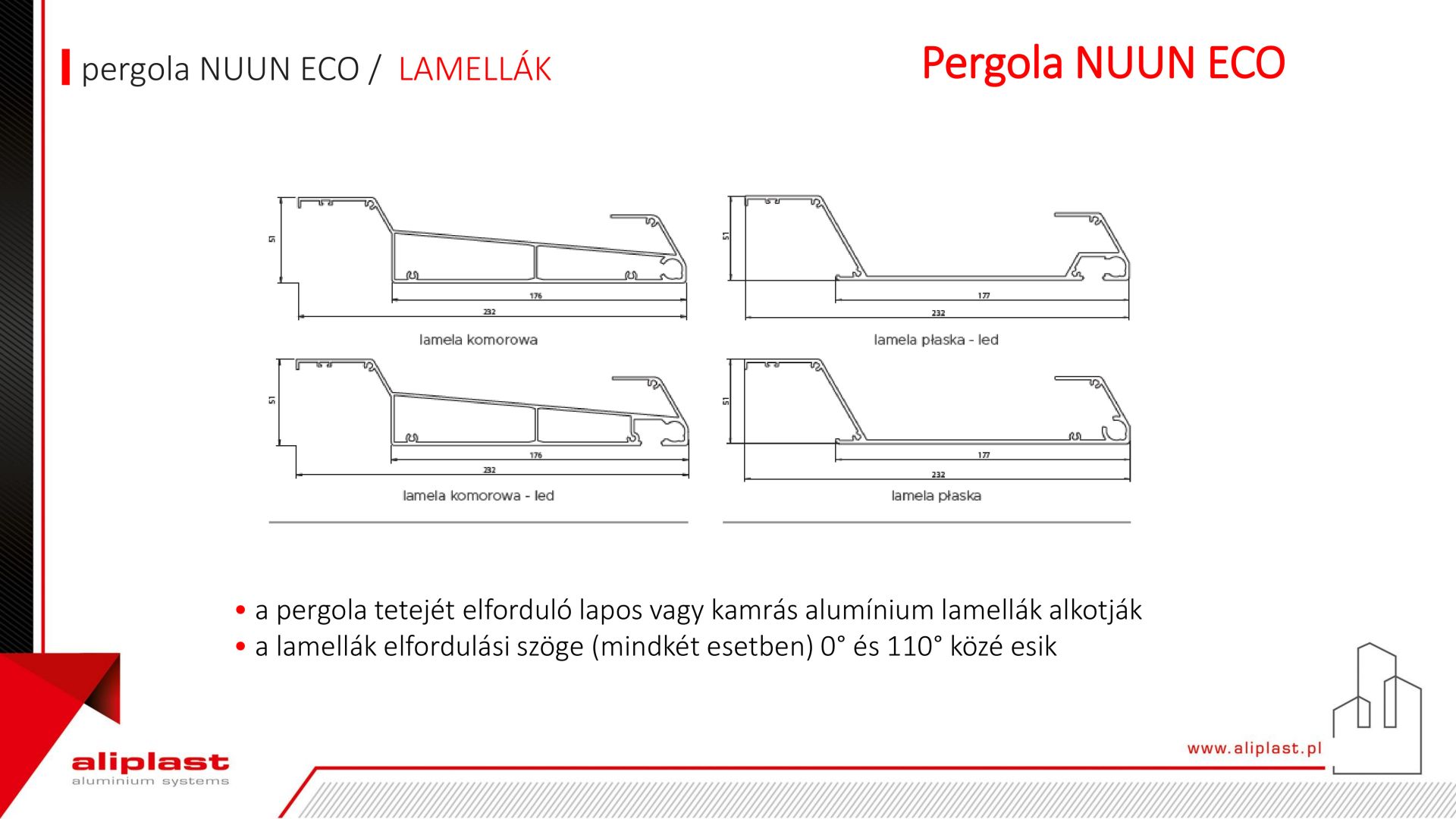 a NUUN ECO pergola zárt teteje szorosan a keretre fekszik, így a lamellák és a szerkezetváz tömítéseinek köszönhetően szigetelt tetőt alkot integrált vízelvezető rendszer az oszlopban további elemek beépítése és a rendszer bővítése: