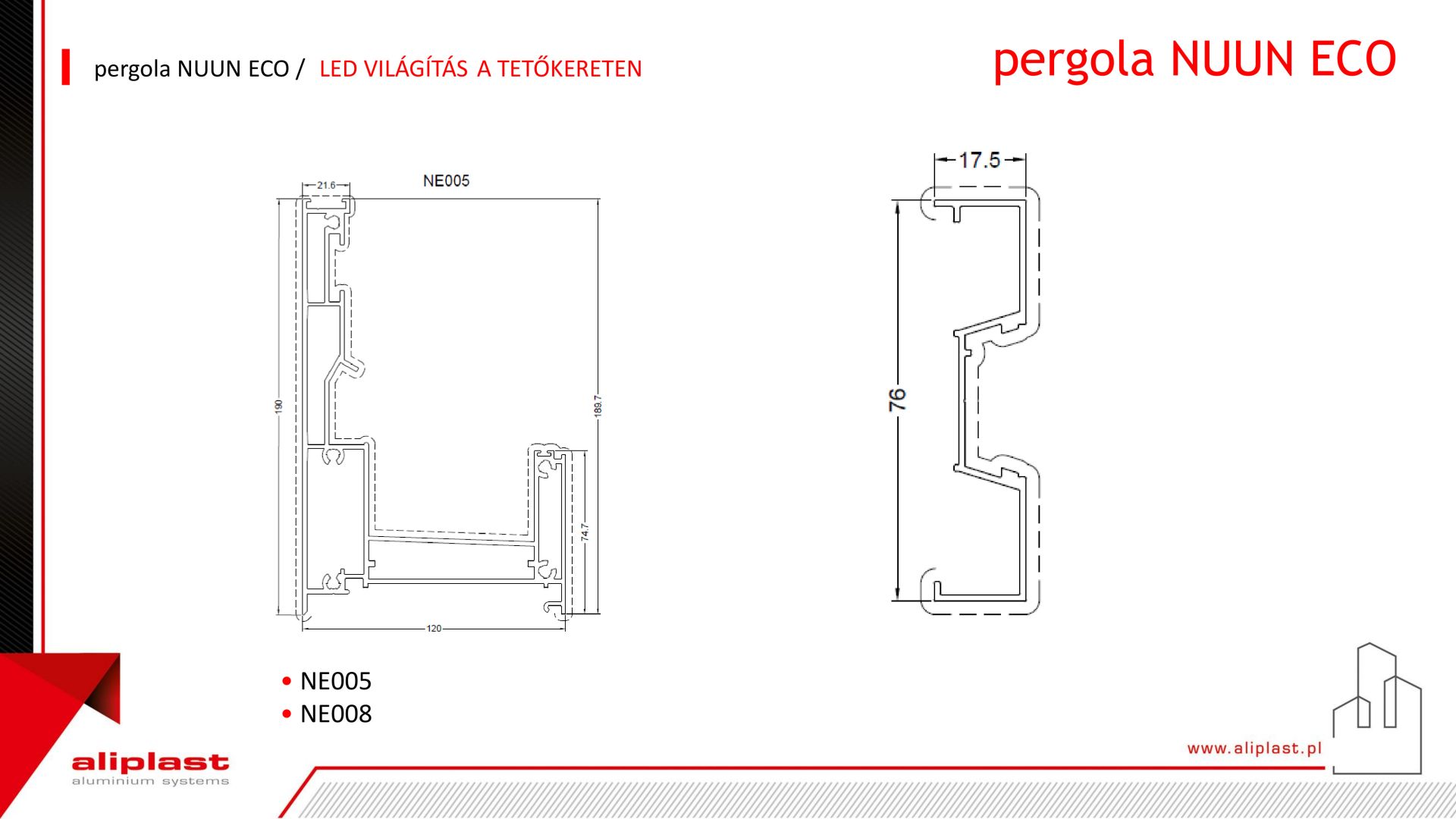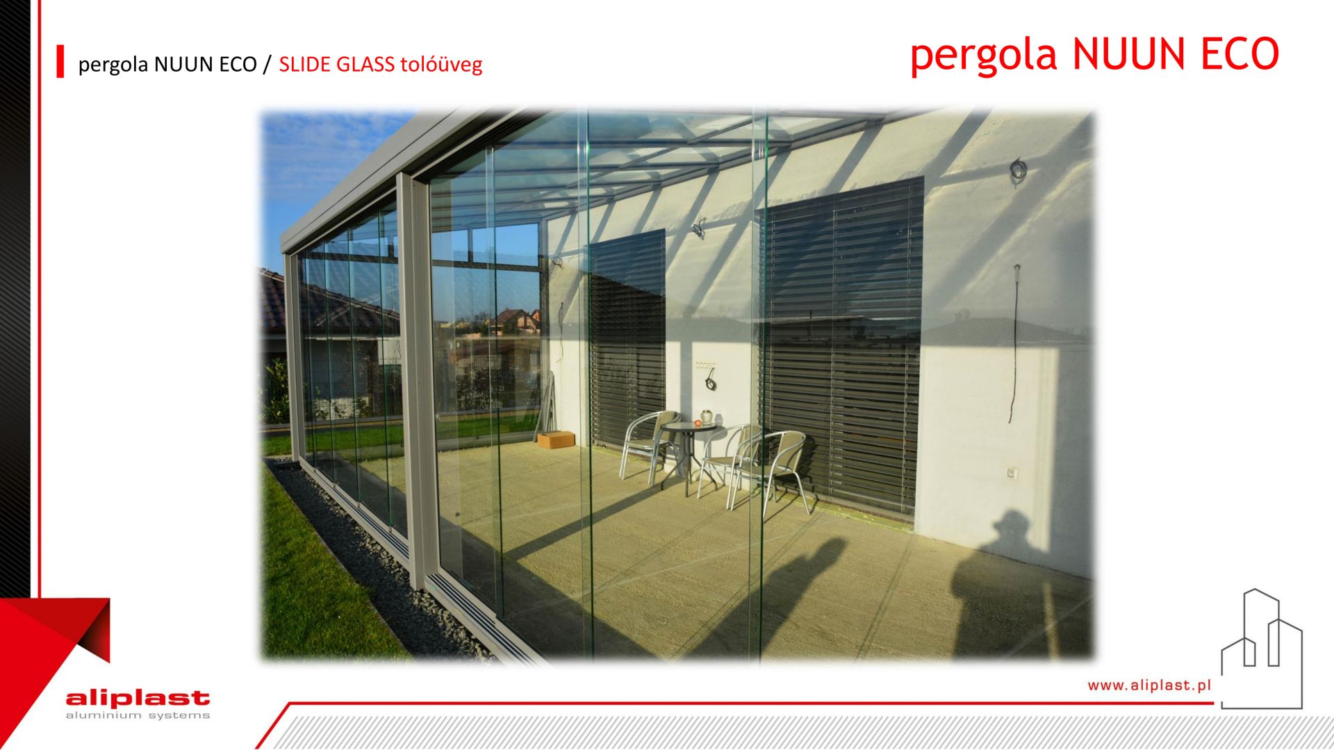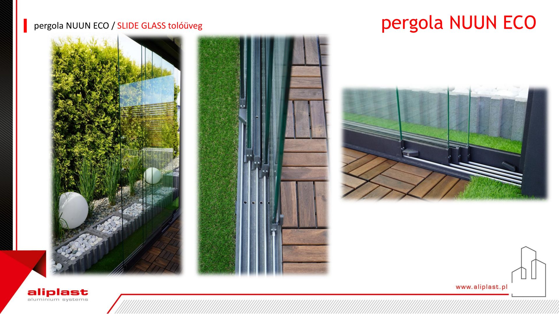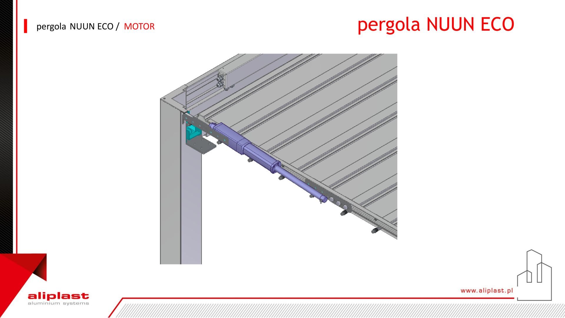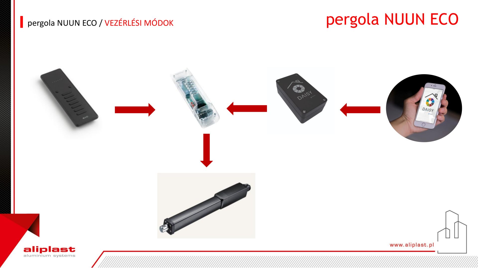 a NUUN ECO pergola zárt teteje szorosan a keretre fekszik, így a lamellák és a szerkezetváz tömítéseinek köszönhetően szigetelt tetőt alkot integrált vízelvezető rendszer az oszlopban további elemek beépítése és a rendszer bővítése: