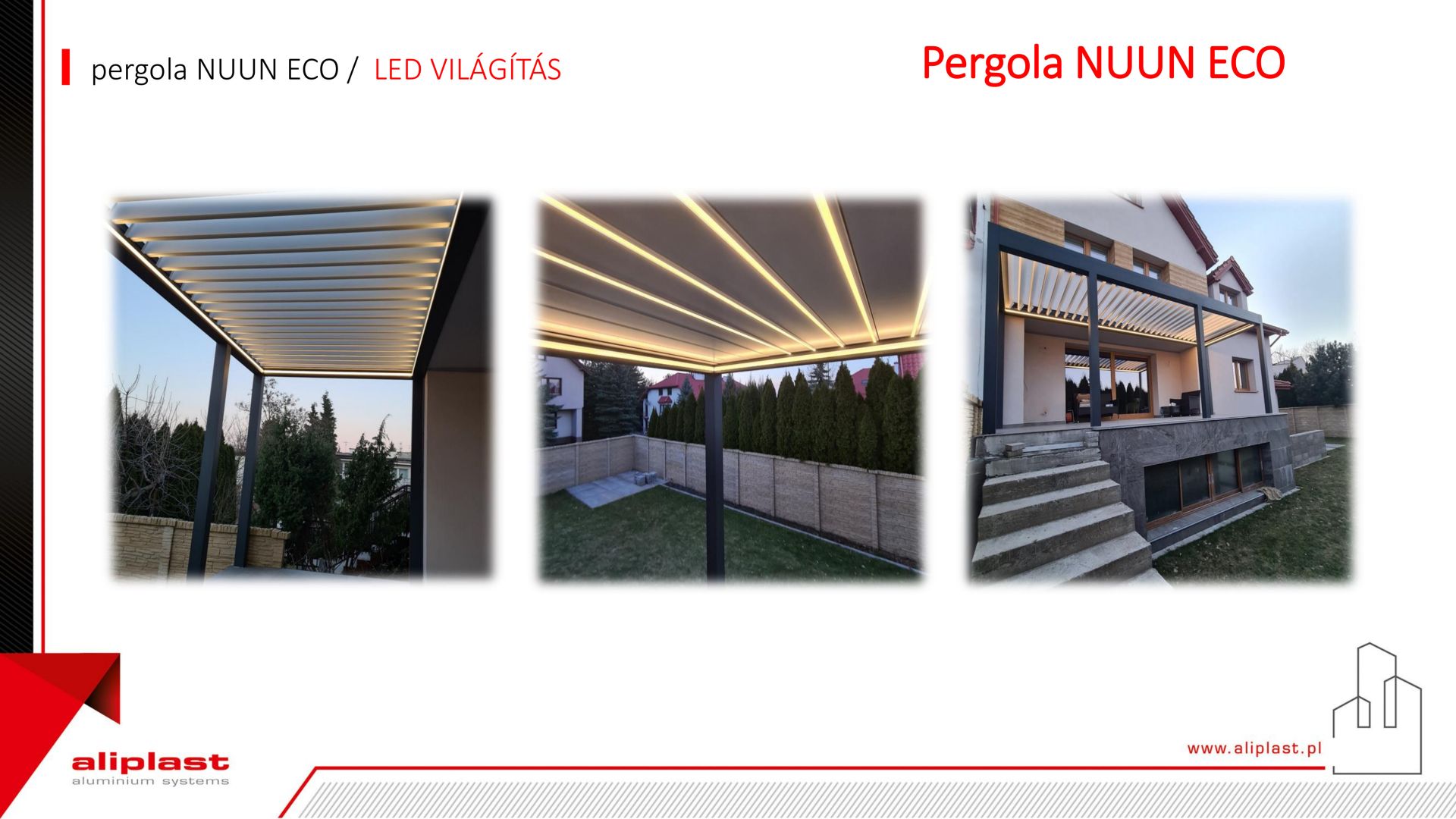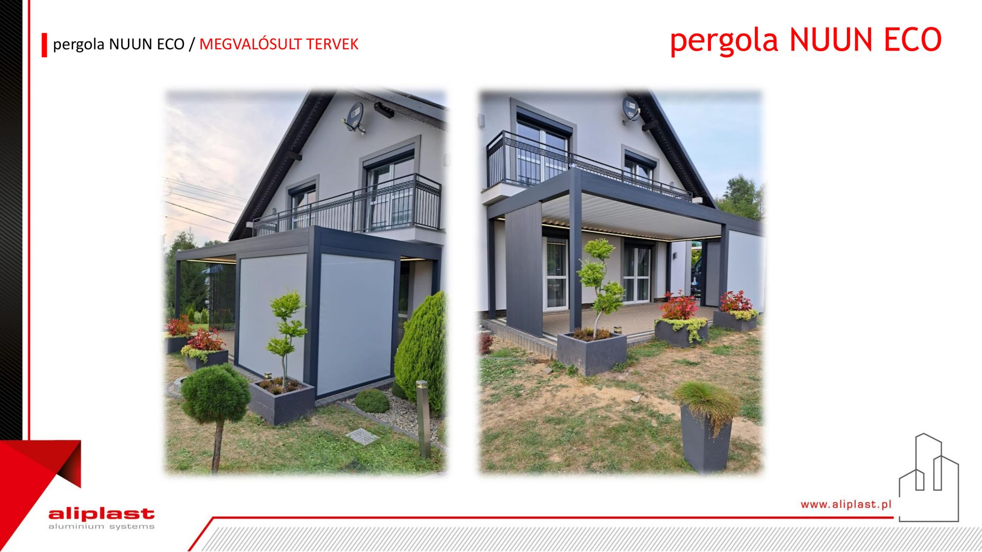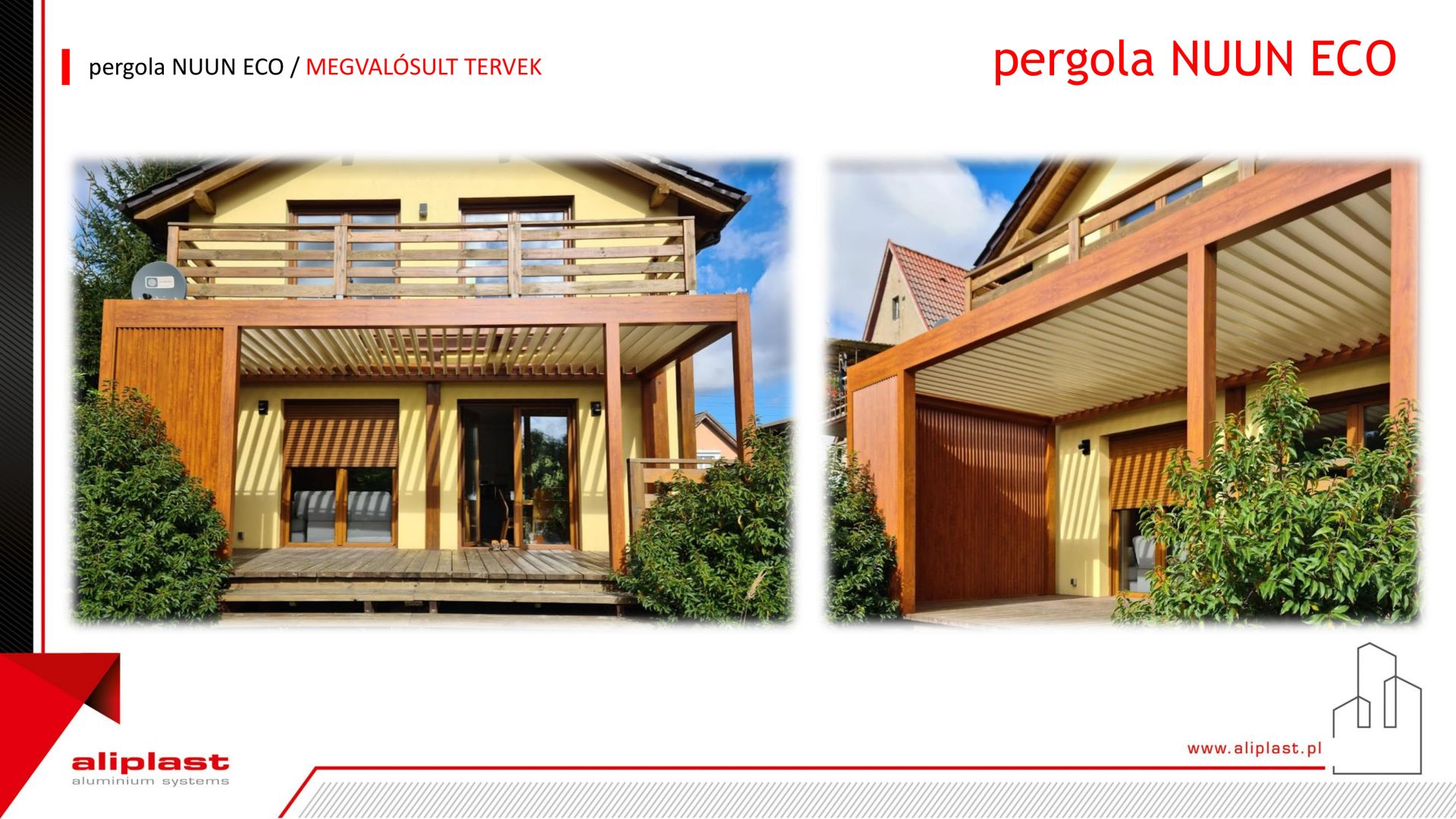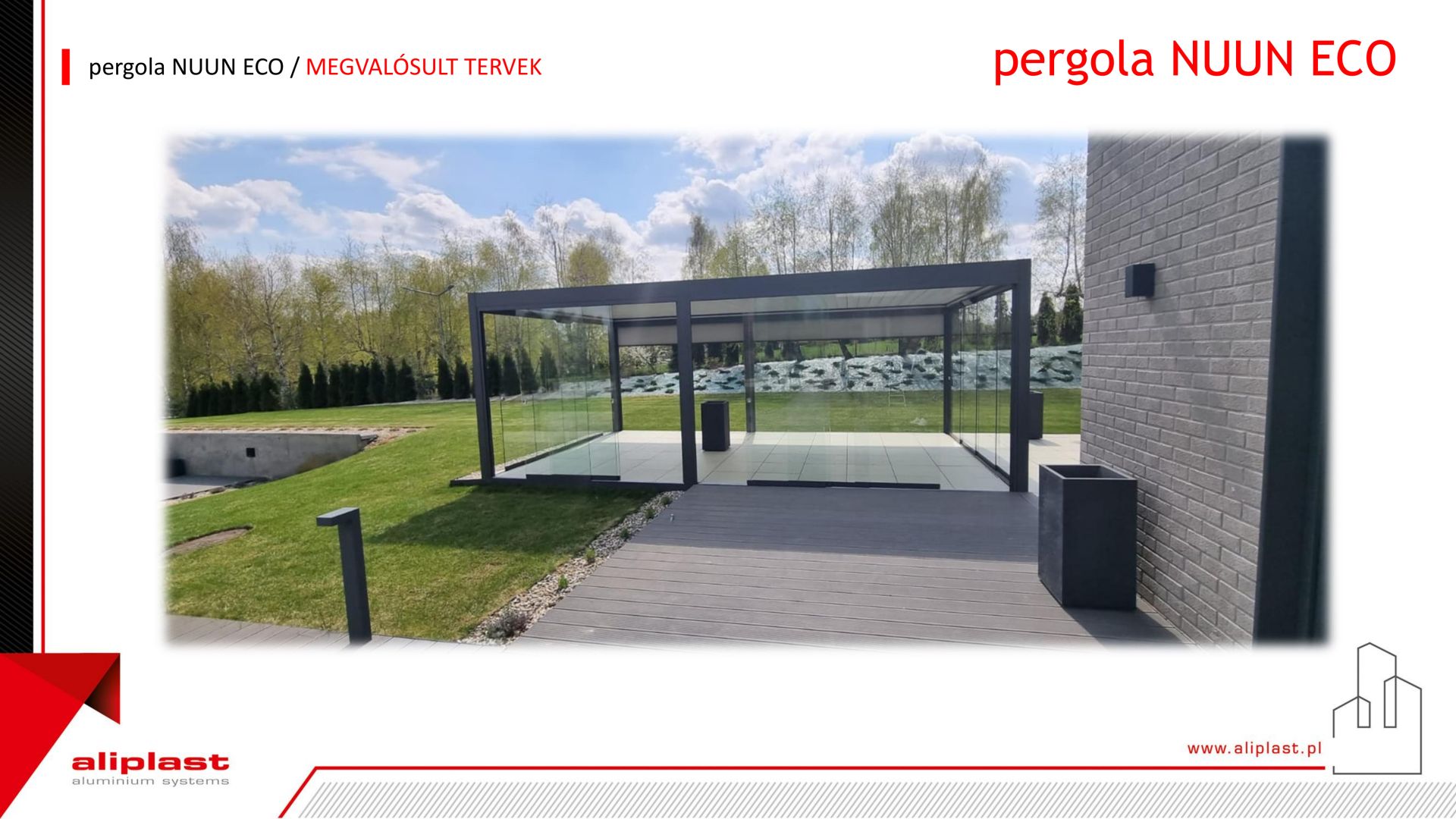 A NUUN ECO pergola egy automatikusan elforgatható lamellákból álló terasztető, amely biztosítja a természetes légáramlást, valamint a védelmet a nap és az eső ellen.