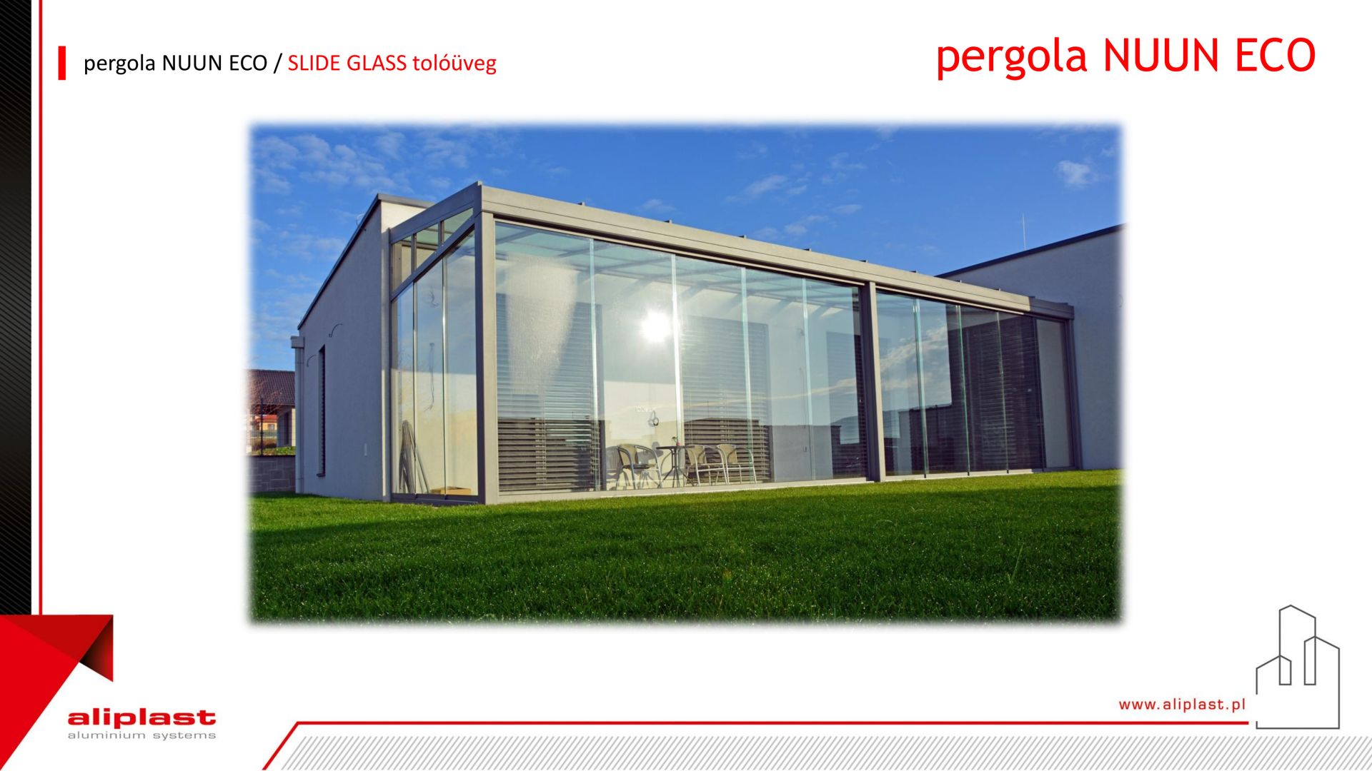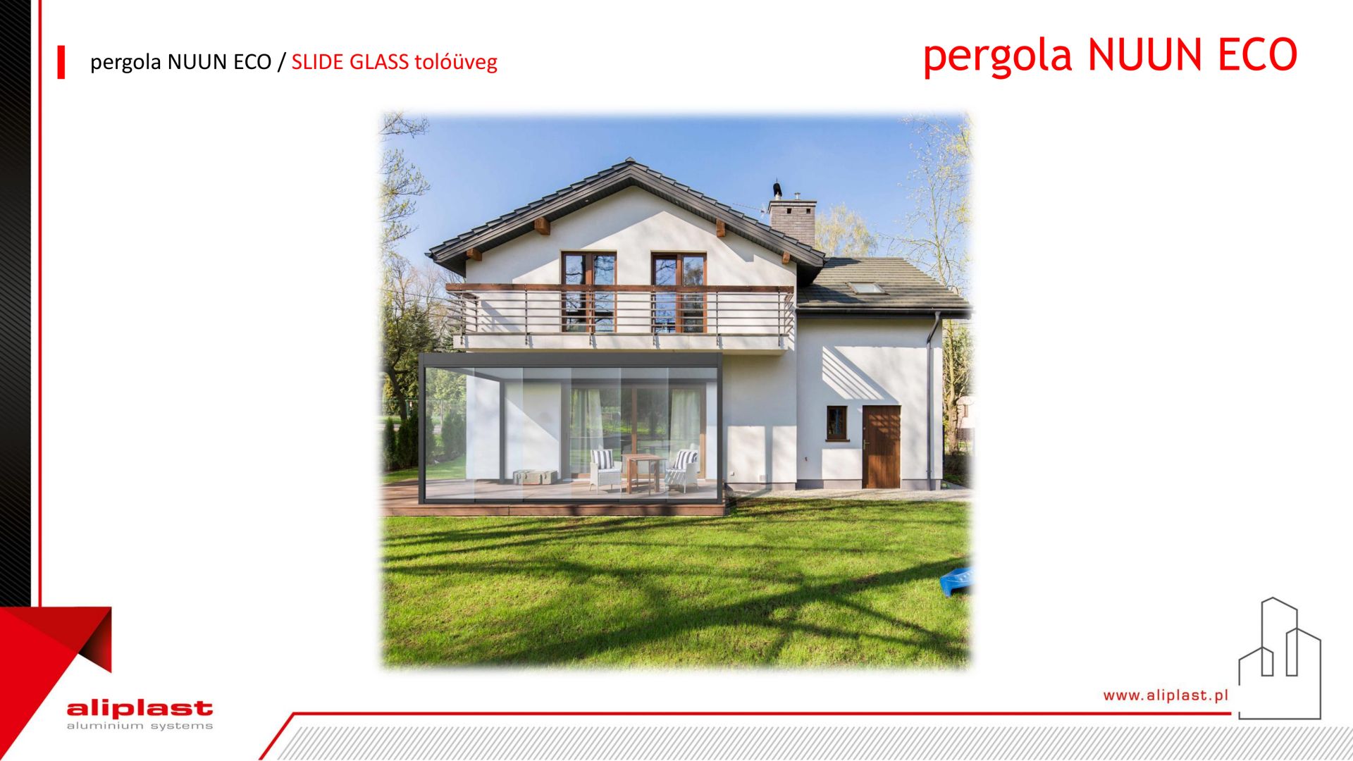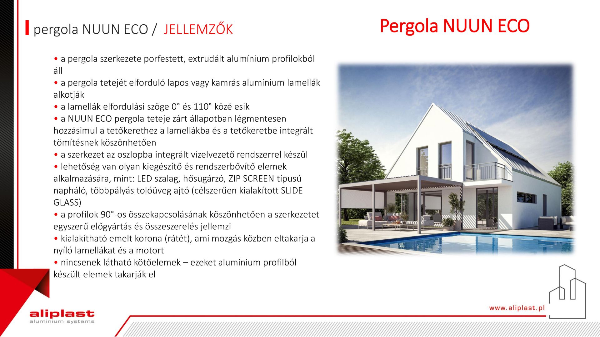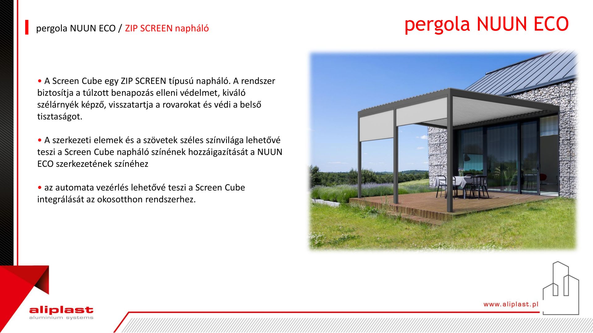 A NUUN ECO pergola egy automatikusan elforgatható lamellákból álló terasztető, amely biztosítja a természetes légáramlást, valamint a védelmet a nap és az eső ellen.