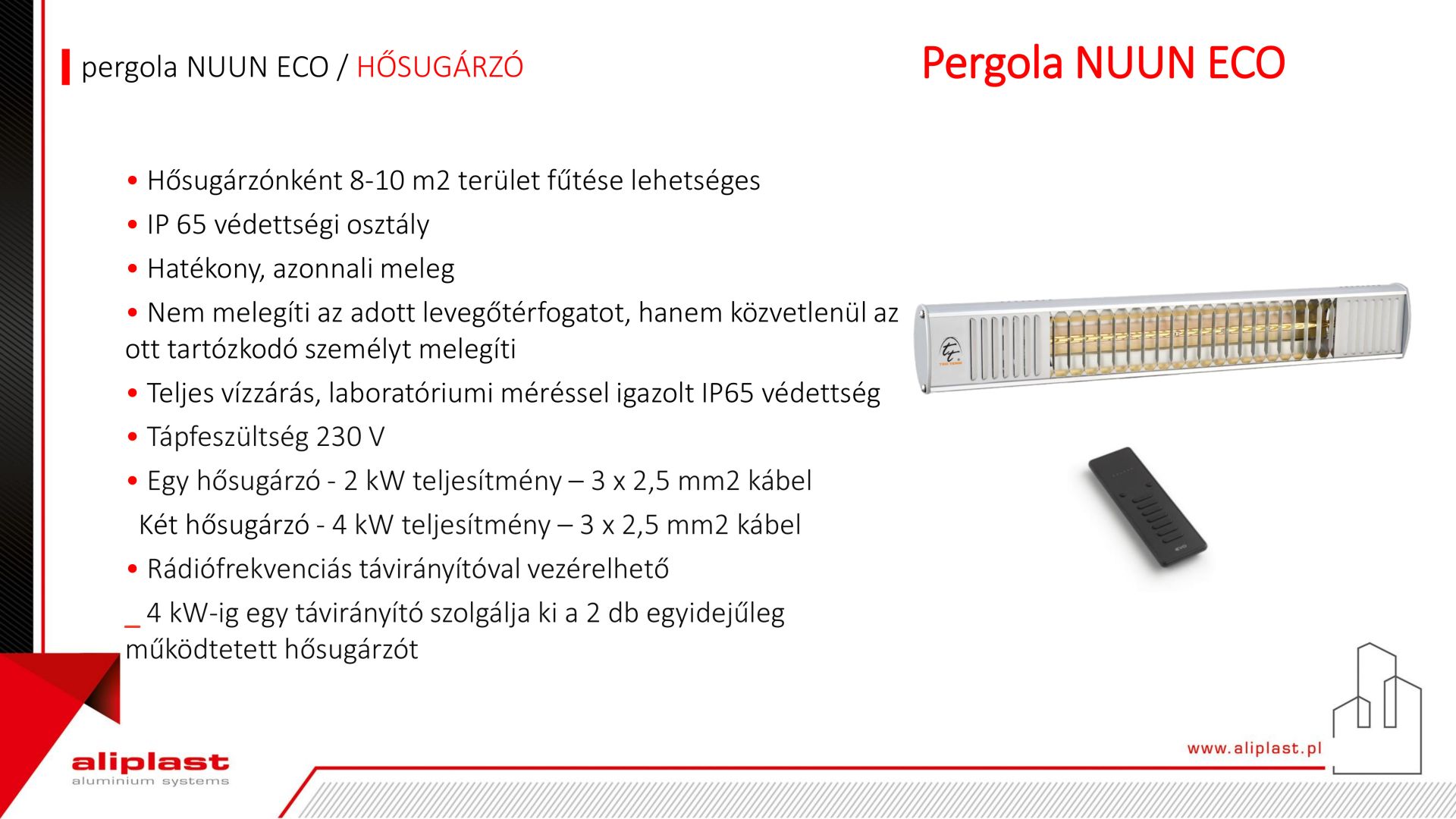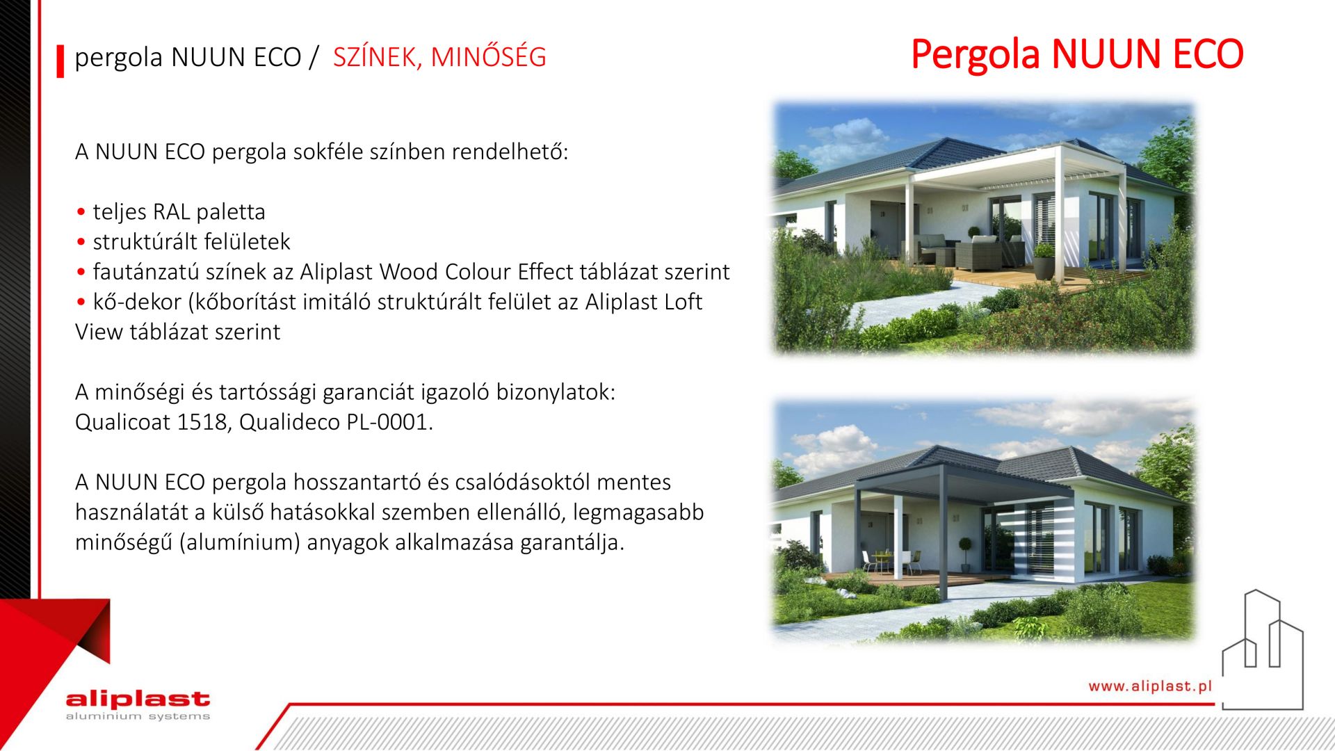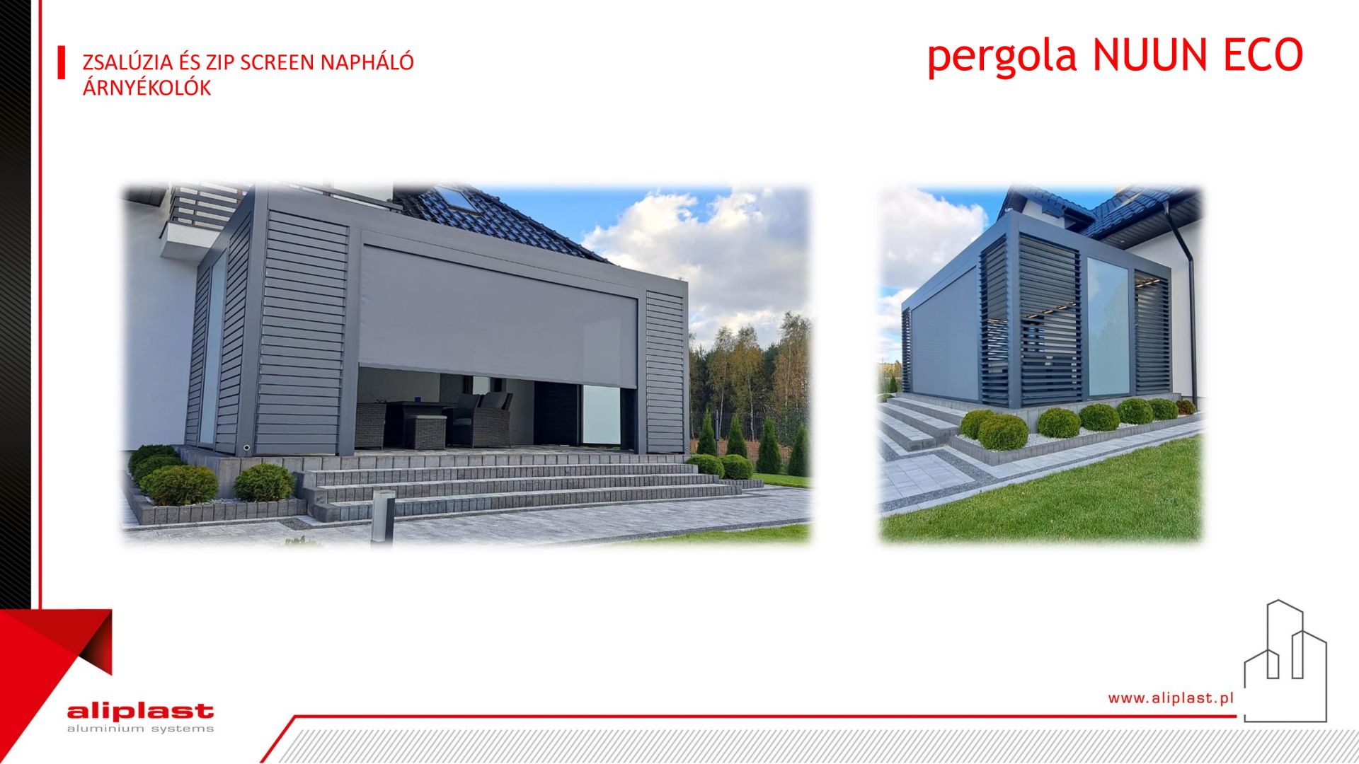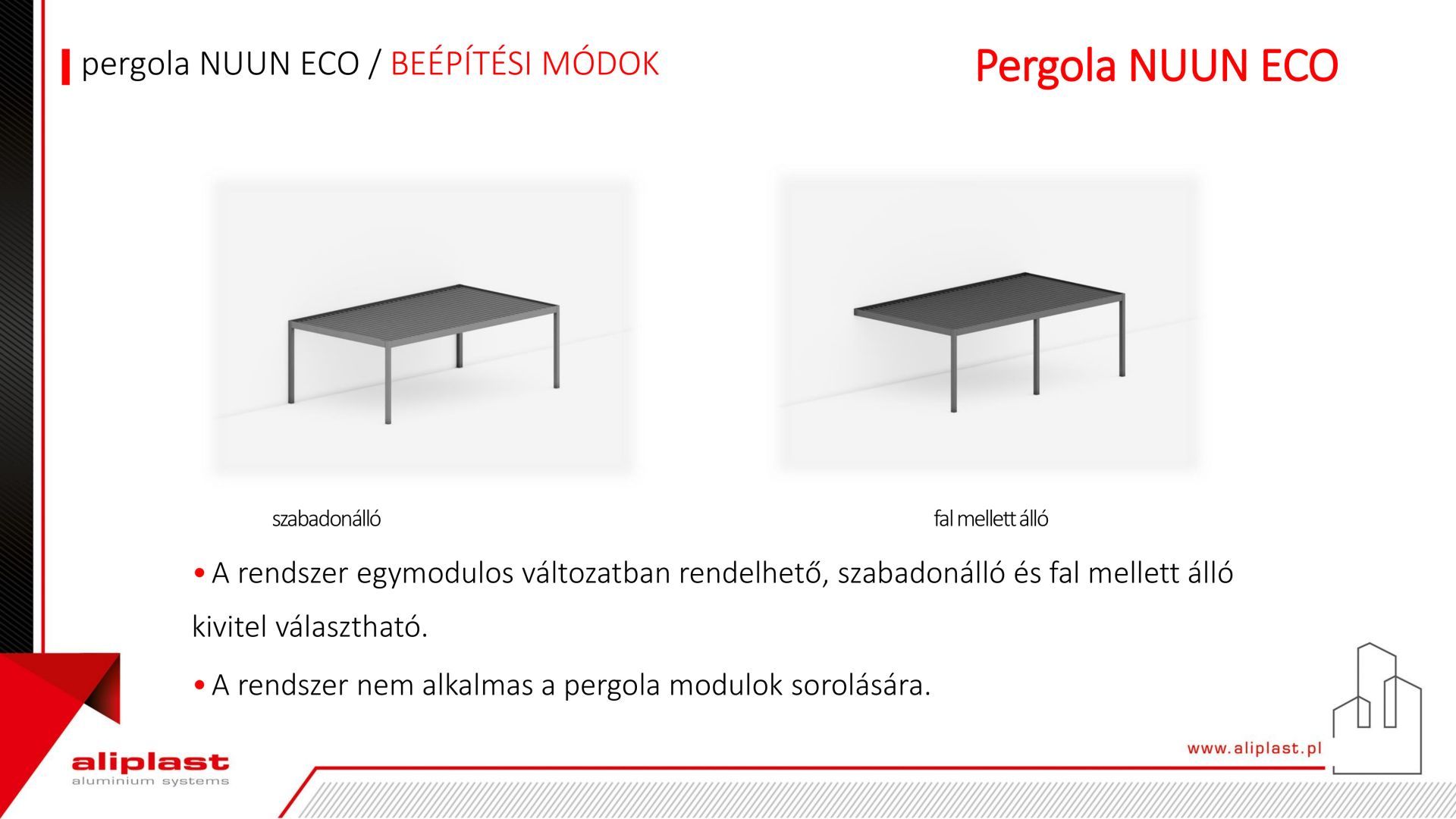 elérhető lehetőségek a NUUN ECO pergola építéséhez: szabadon álló, fal mellé szerelhető